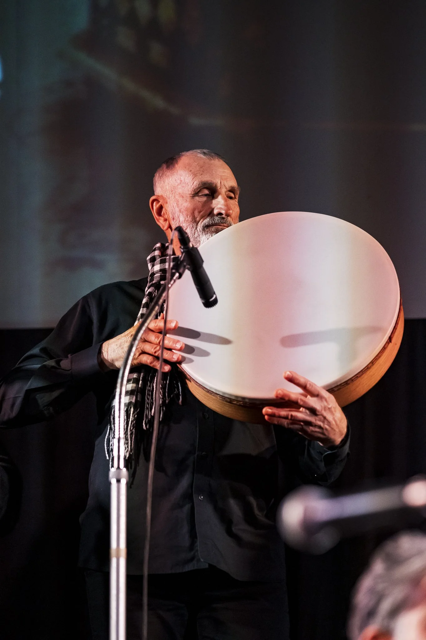 Stephen plays a full drum kit as well as darabuka and frame drum